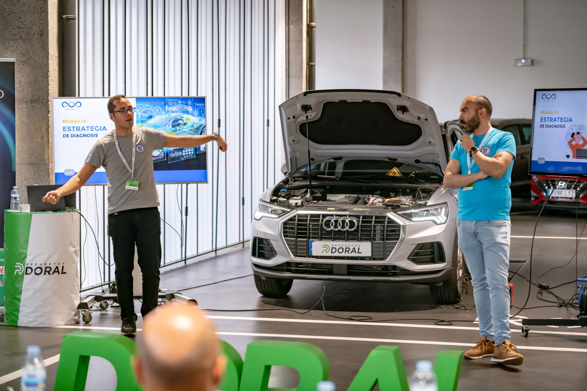 En un segundo día eminentemente práctico, los alumnos pudieron conocer el funcionamiento y uso de dispositivos de medición como los multímetros, las pinzas amperimétricas y los osciloscopios. También se analizaron los diferentes tipos de buses de datos que existen en la actualidad, sus diferencias y principales características. Siempre a la última en cuanto a tecnología, Repuestos DORAL también quiso que los participantes profundizaran en la lectura de esquemas eléctricos y trabajaran en la diagnosis de vehículos híbridos y eléctricos, incluyendo sus baterías de alto voltaje o la localización de averías en sus sistemas de carga y sistemas de climatización.